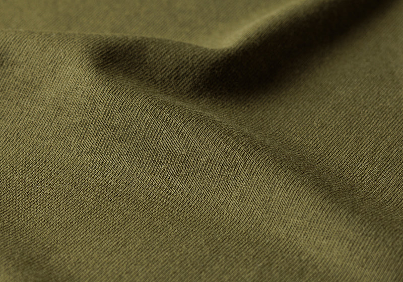 米国サーキュラーシステムズ社が展開する、廃棄された生地から高品質な糸へ再生するTexloop™によりリサイクルされたR-COT™を50%、オーガニックコットン等50%で混紡し、20番手の太い綿糸で編み上げた、使い心地とサスティナブルを両立した、肉厚な天竺編みのニット生地です。適度なストレッチがあるので、皺になりにくく、装着した際によくフィットします。Texloop™のリサイクルコットンは、元の繊維と同等の品質を保って、再度リサイクルすることが可能なため、綿花生産のための土地や水を必要とせず、二酸化炭素の排出量も削減される、地球に優しい素材です。